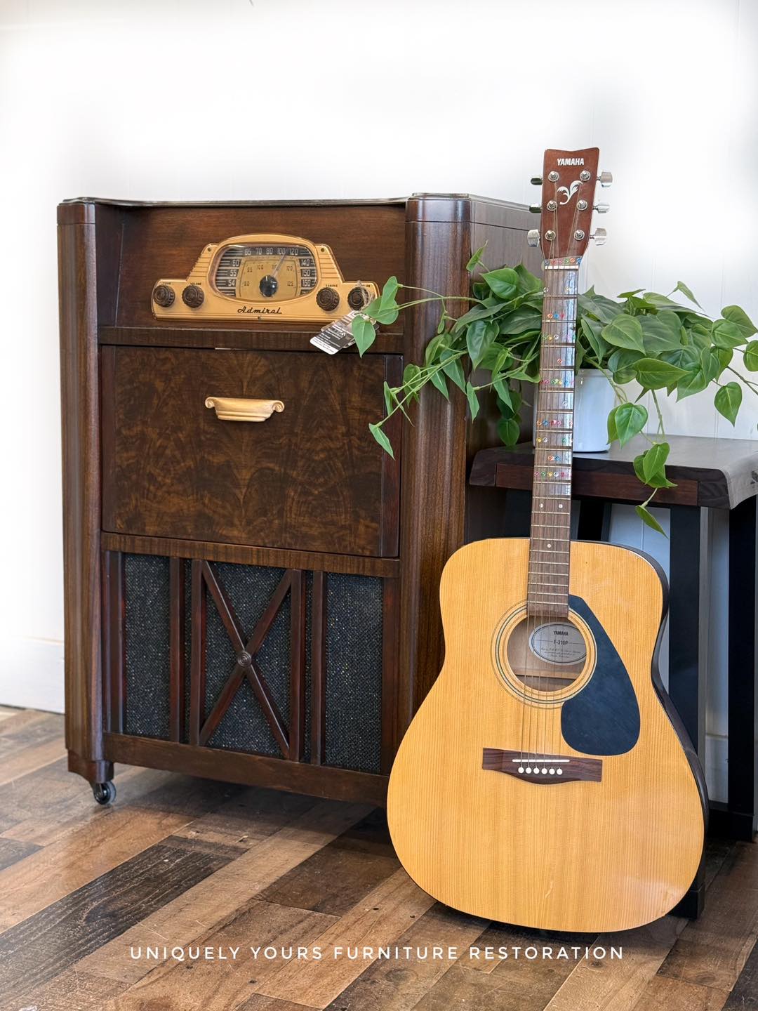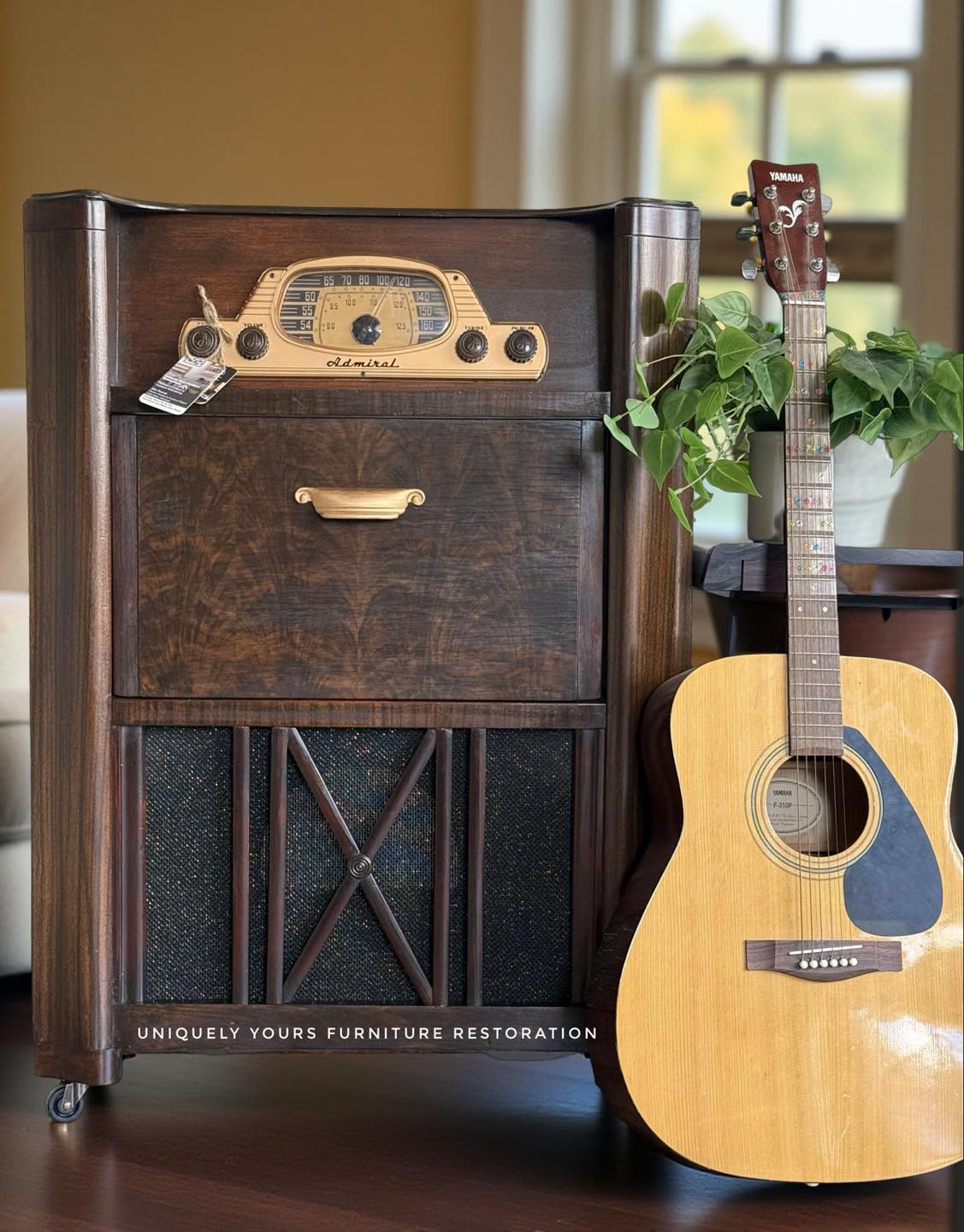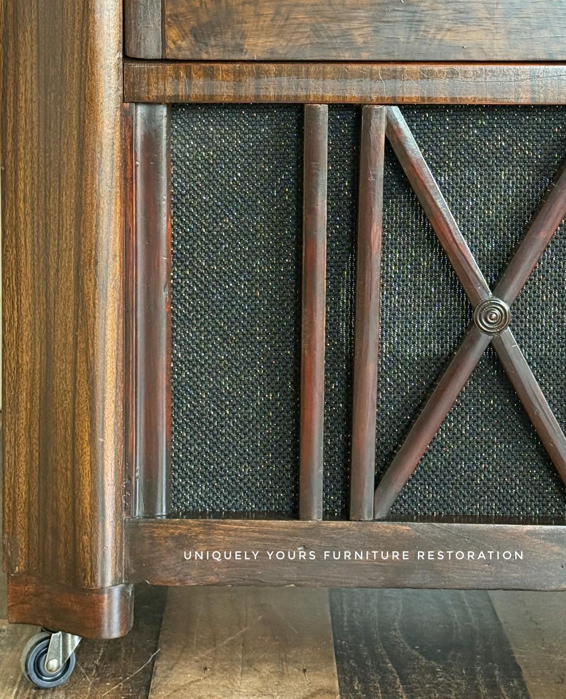 Repurposed cabinet, beautifully designed from an art deco style 1940’s Admiral radio! Completely refinished bar cart, this eye-catching piece is ideal for a man cave, media room, finished basement, or dining area—it's sure to be an amazing conversation piece in your home or office!