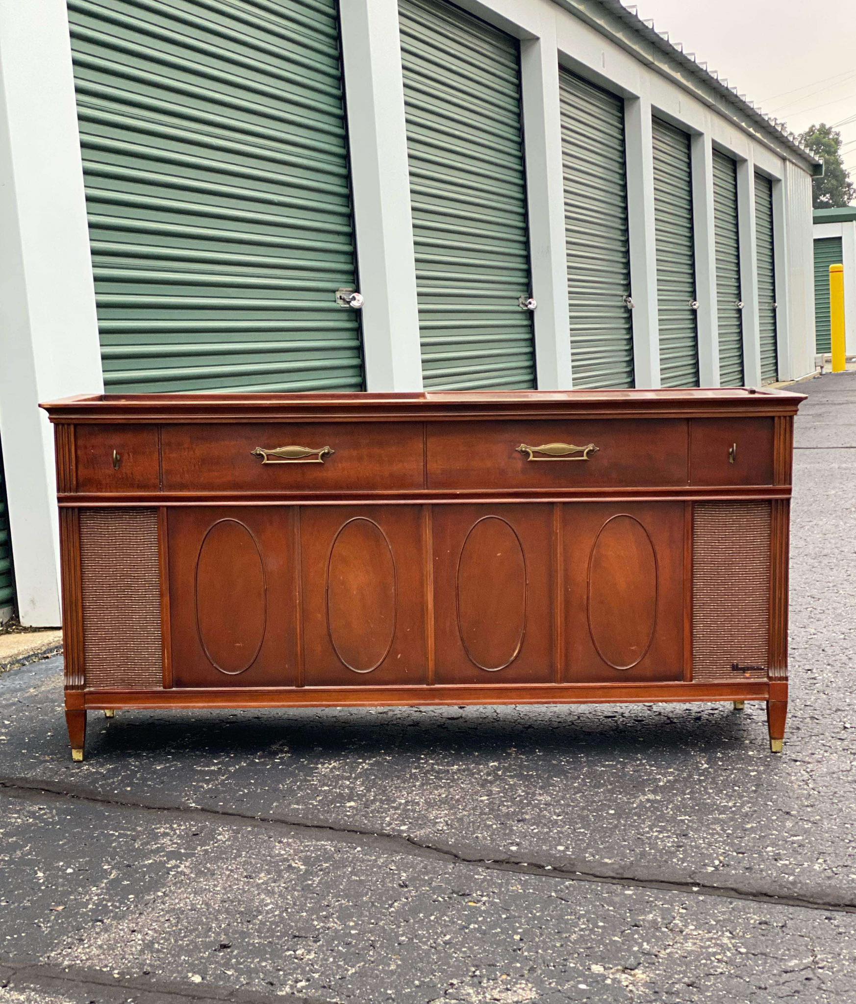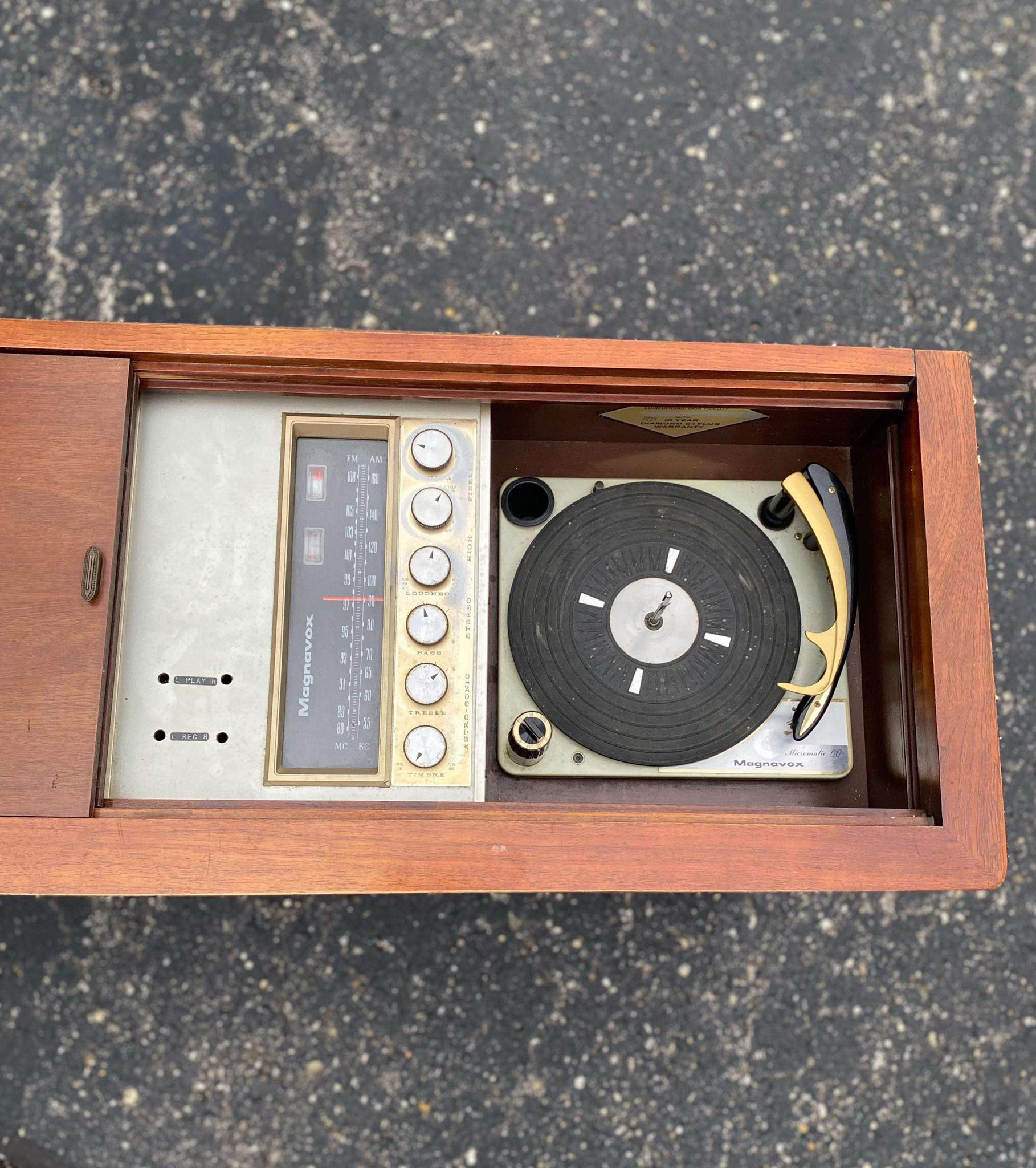 Check out this gorgeous Vintage Magnavox Imperial Micromatic Stereo Player in Walnut Cabinet with decorated fabric panels in front and sides, ready for a full restoration. One side stereo and record player with stunning gold components while the other side has huge storage space for all your favorite records. Cabinet is in great solid condition for its age and use. Super awesome piece and a rare find. Add Bluetooth feature to listen to music, podcasts, or audiobooks from your smartphone.