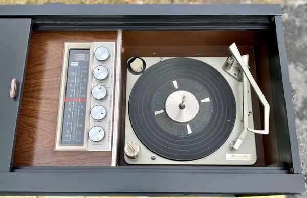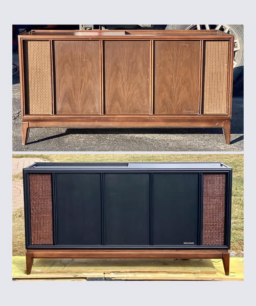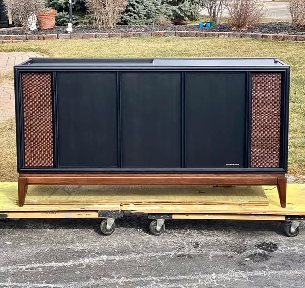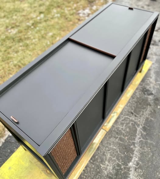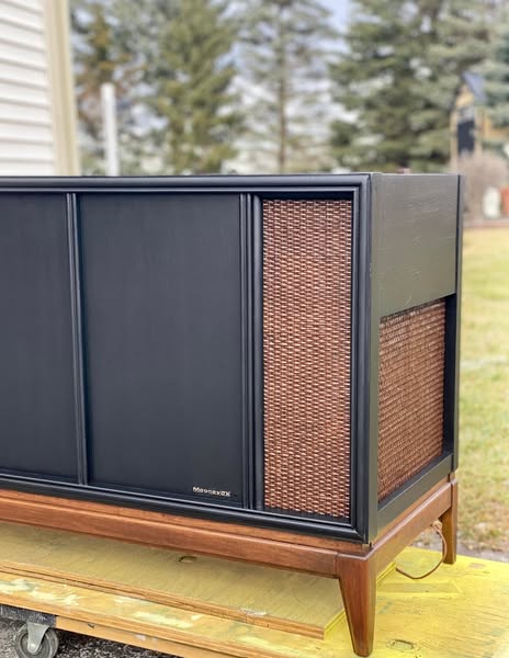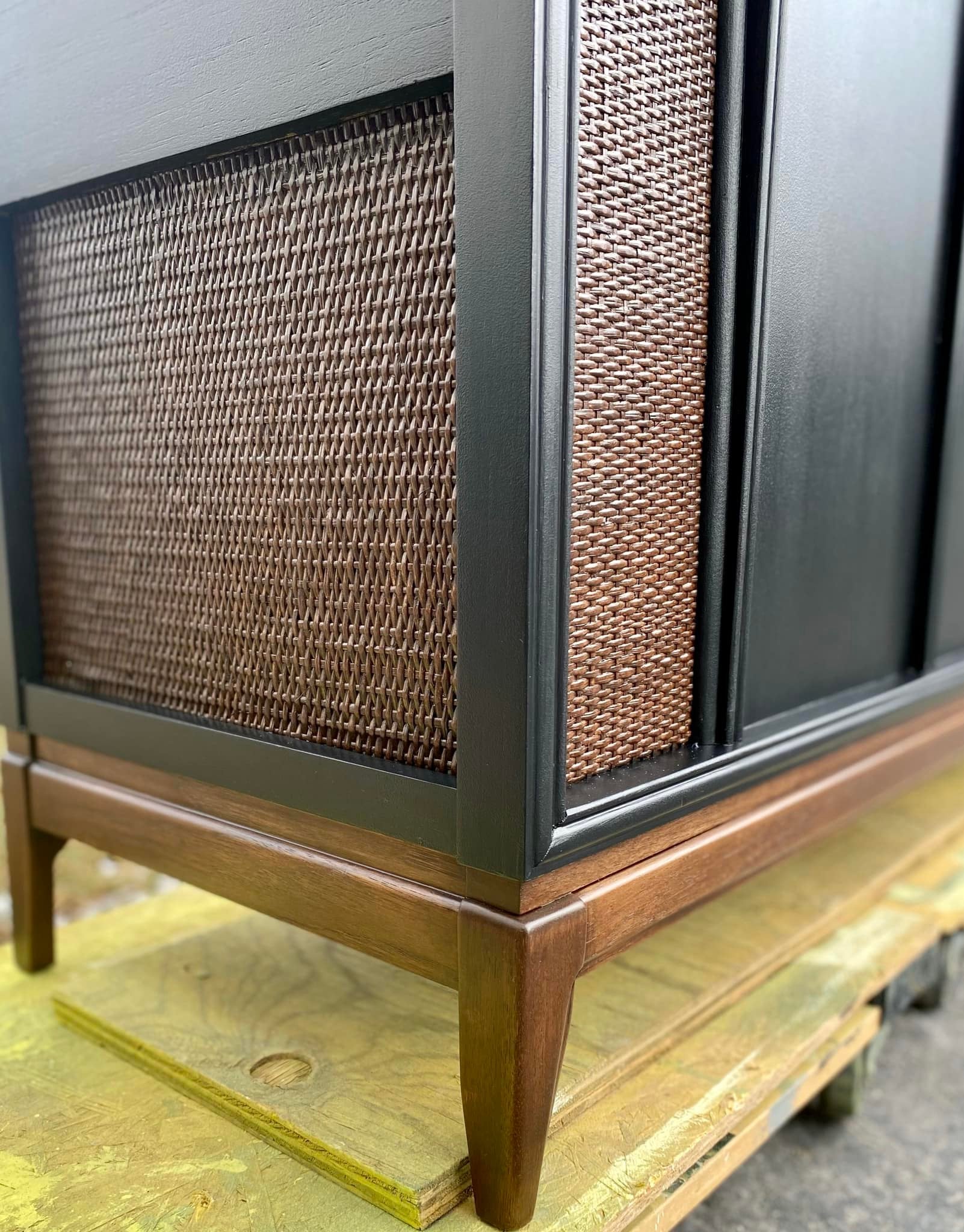 Another MCM Magnavox beauty went to it’s new home and the new owners couldn’t be more thrilled with their new purchase. Professionally restored and refinished in Coal Black with a Walnut stain, then sealed to perfection! Check out the gorgeous cane webbing our client chose instead of speaker fabric! Definitely gives it a more vibrant look. Totally fabulous isn’t it?