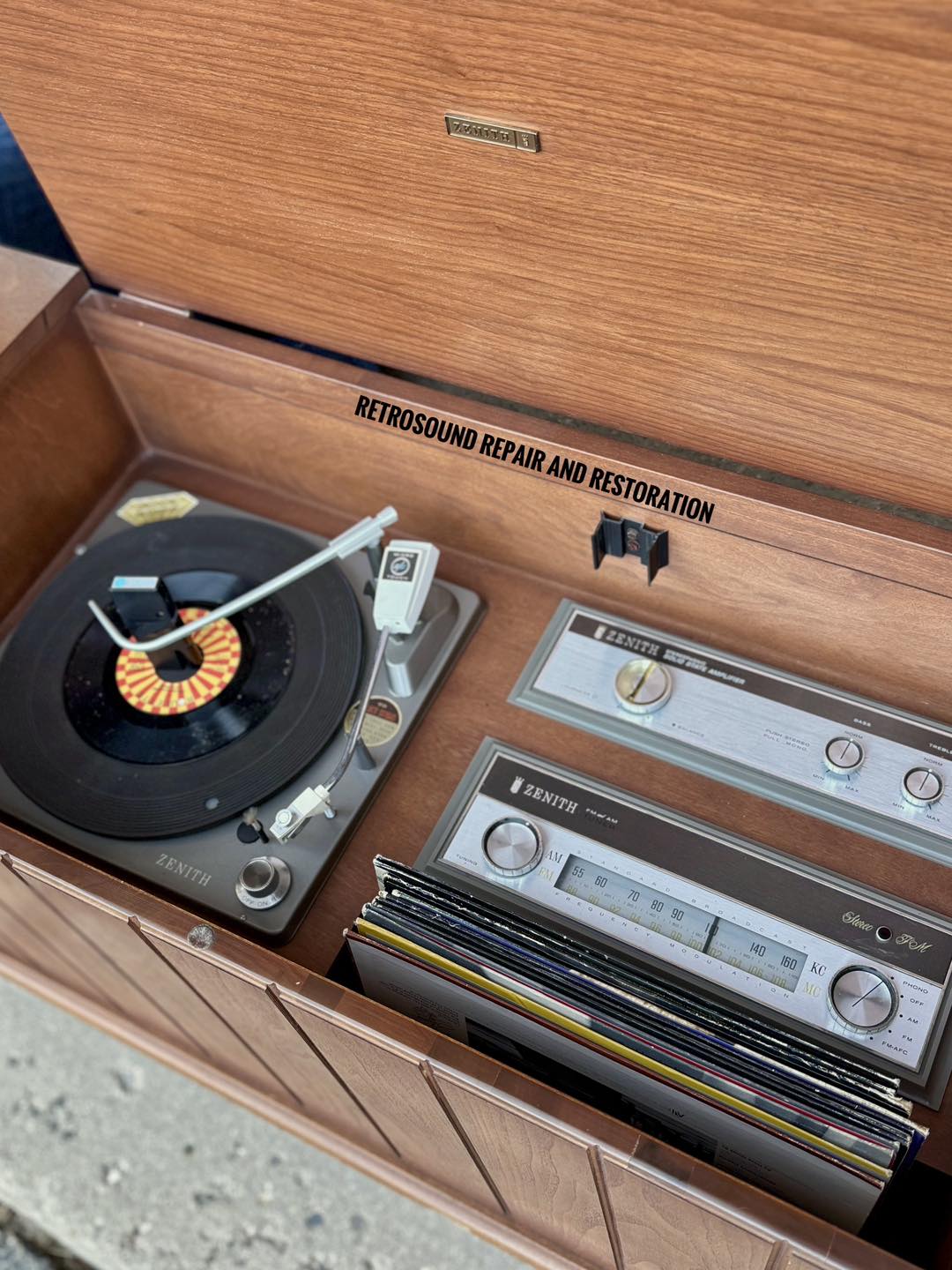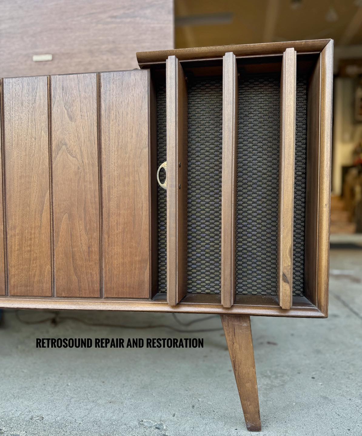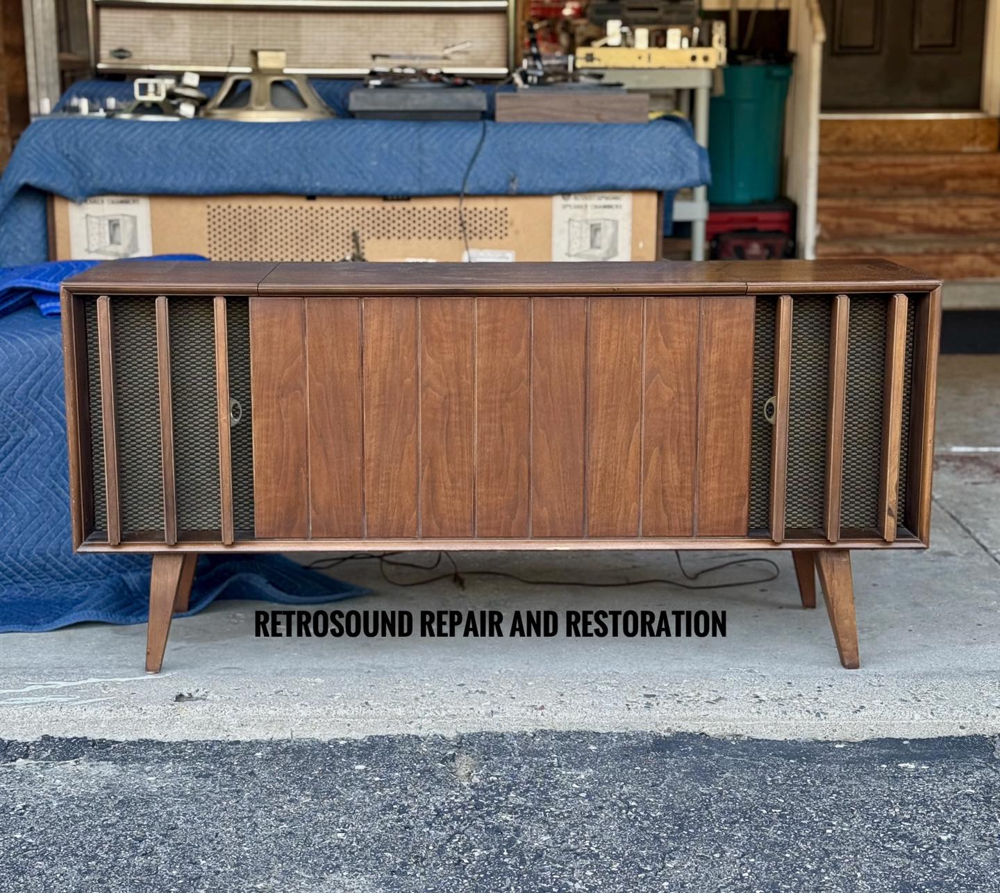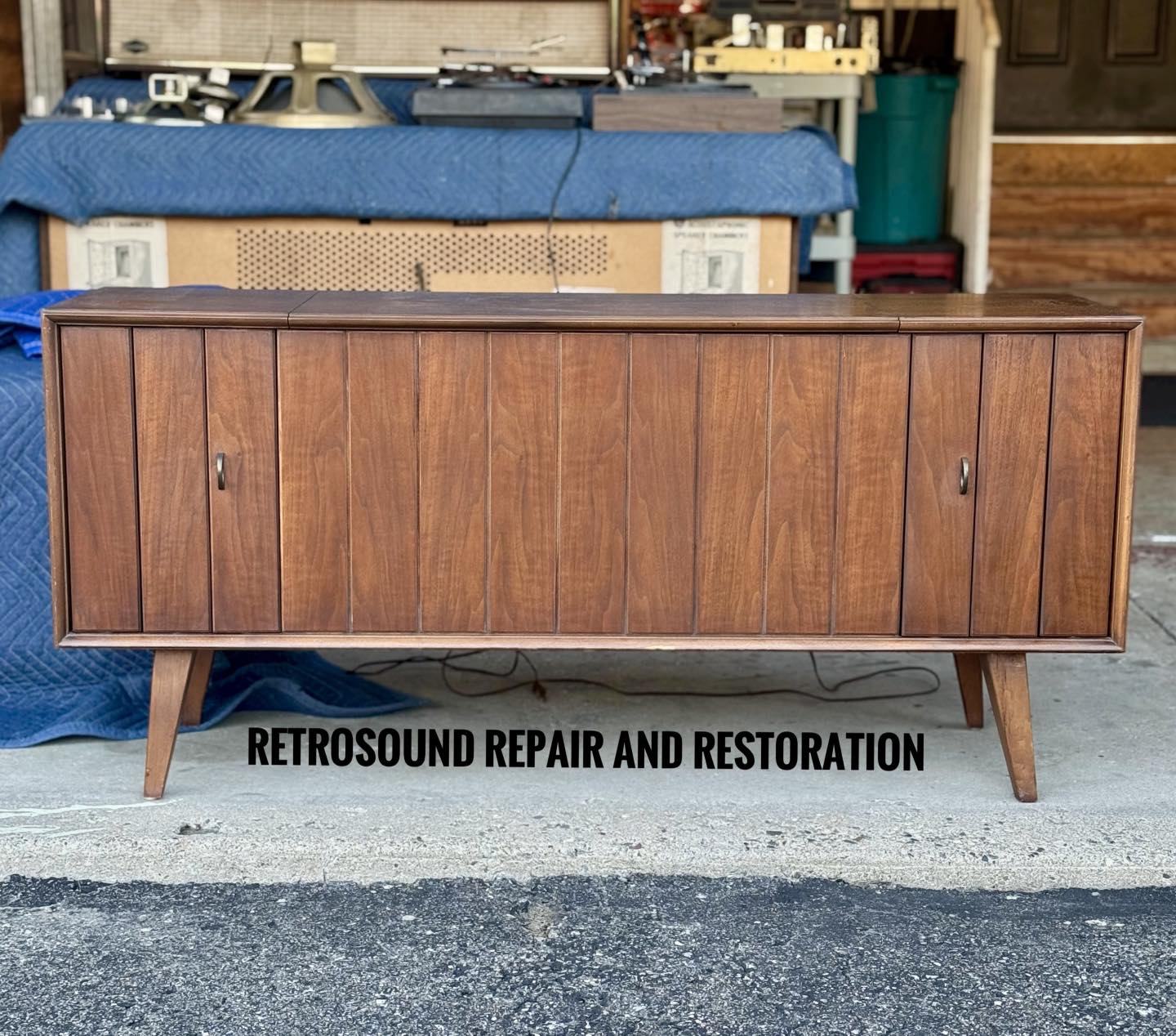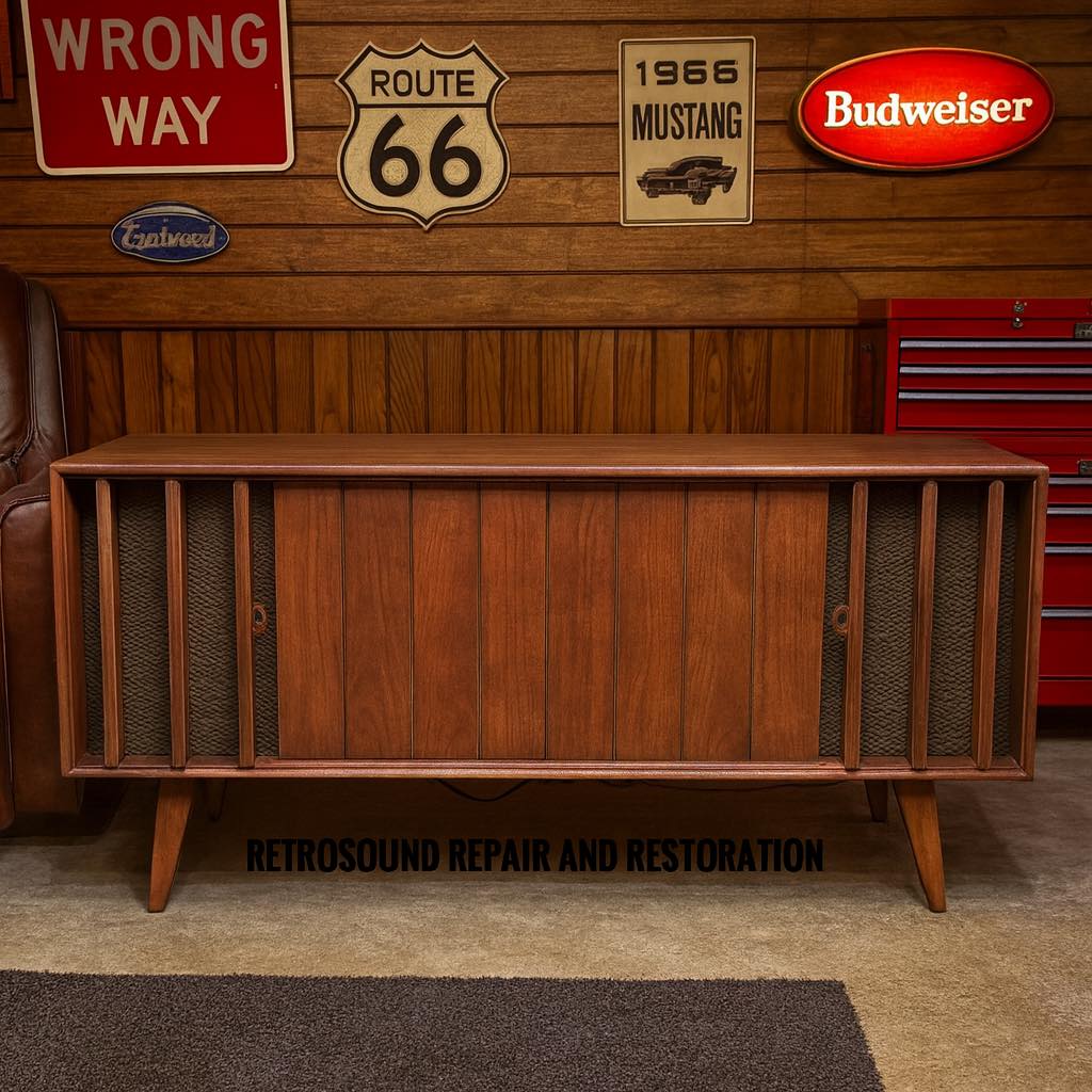 We will perform a full service on the electronics to ensure it plays at its optimal range. These consoles perfectly embody the Mid-Century Modern aesthetic, featuring clean lines, rich walnut finishes, and elegantly sculpted legs. In the 1960s, they were cherished not only as functional stereo systems but also as stylish furniture pieces.