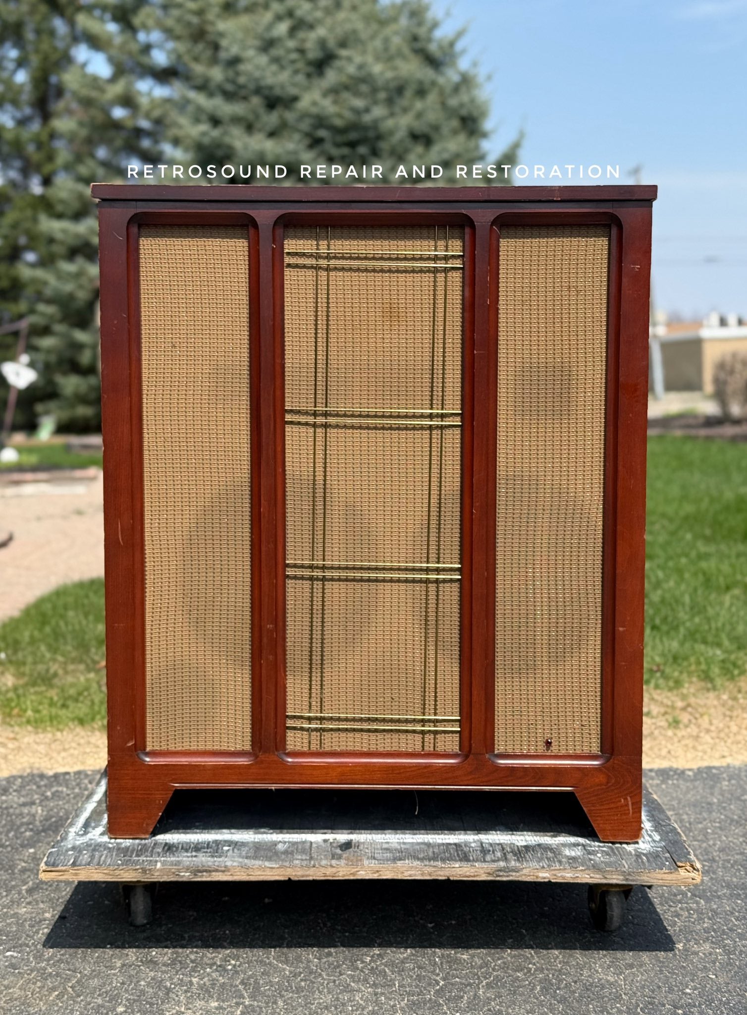 This iconic piece, popular in the mid-20th century, features an elegant mahogany wooden cabinet that elegantly houses a record player, AM/FM radio, and ample storage for your favorite albums.