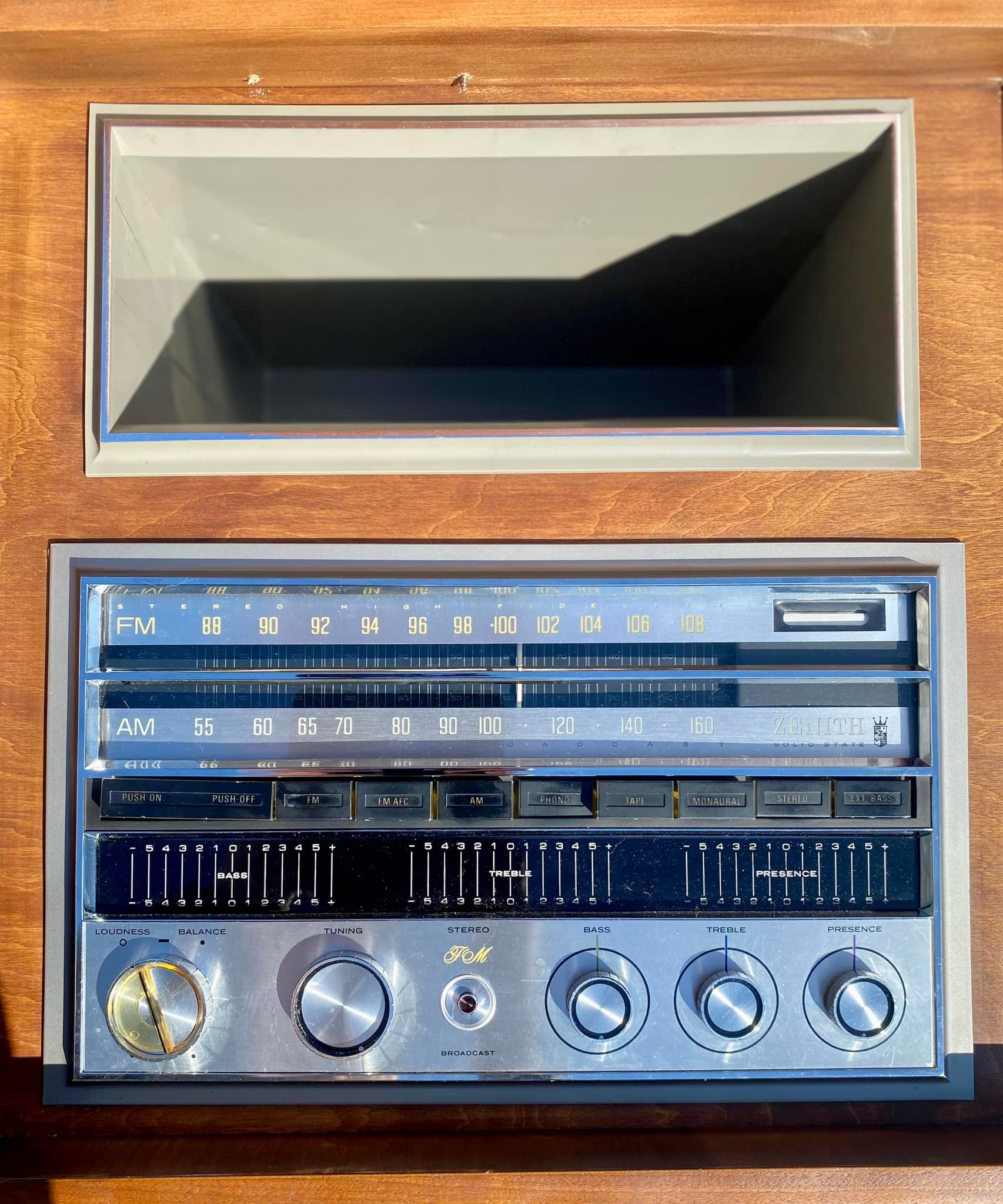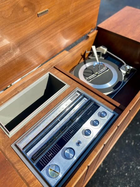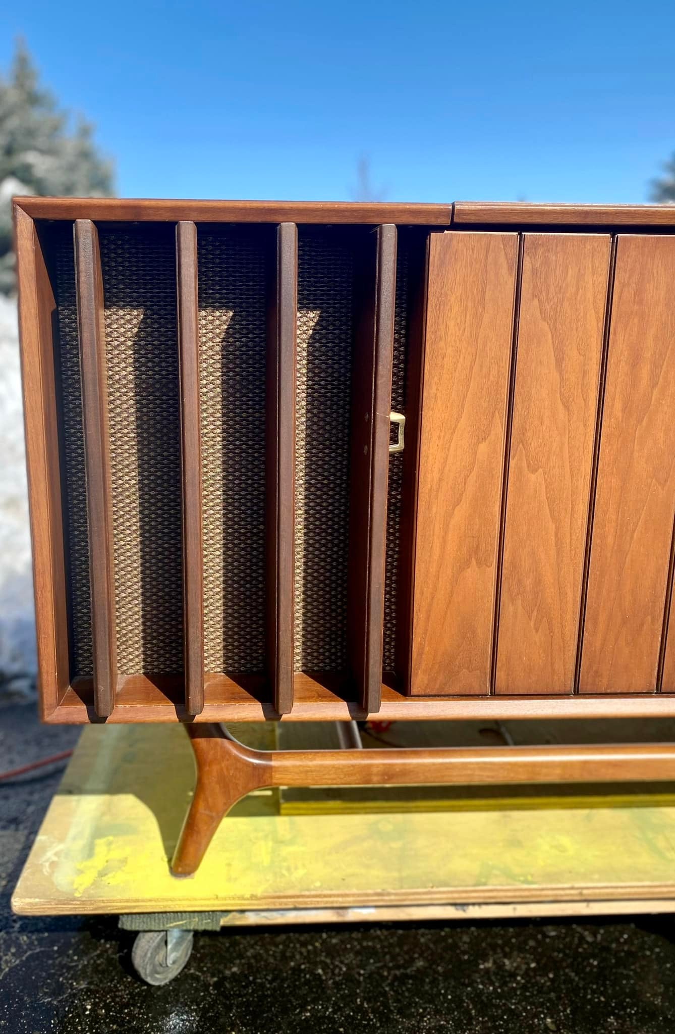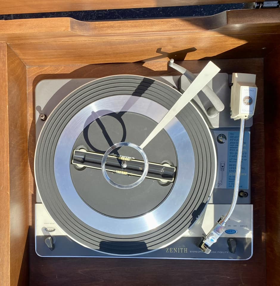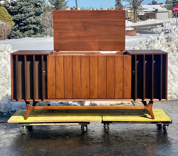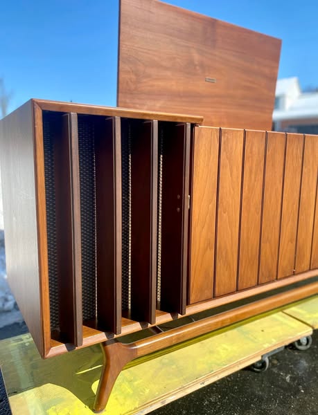 Restored back to its proper working condition this unit returned home to Paw Paw, Michigan yesterday. Look how this Zenith just glistens in the sun! Absolutely loved the uniqueness of this piece. Check out the photos, the speakers have door slates that open and shut! Stick around, videos of this unit playing on its way!!
